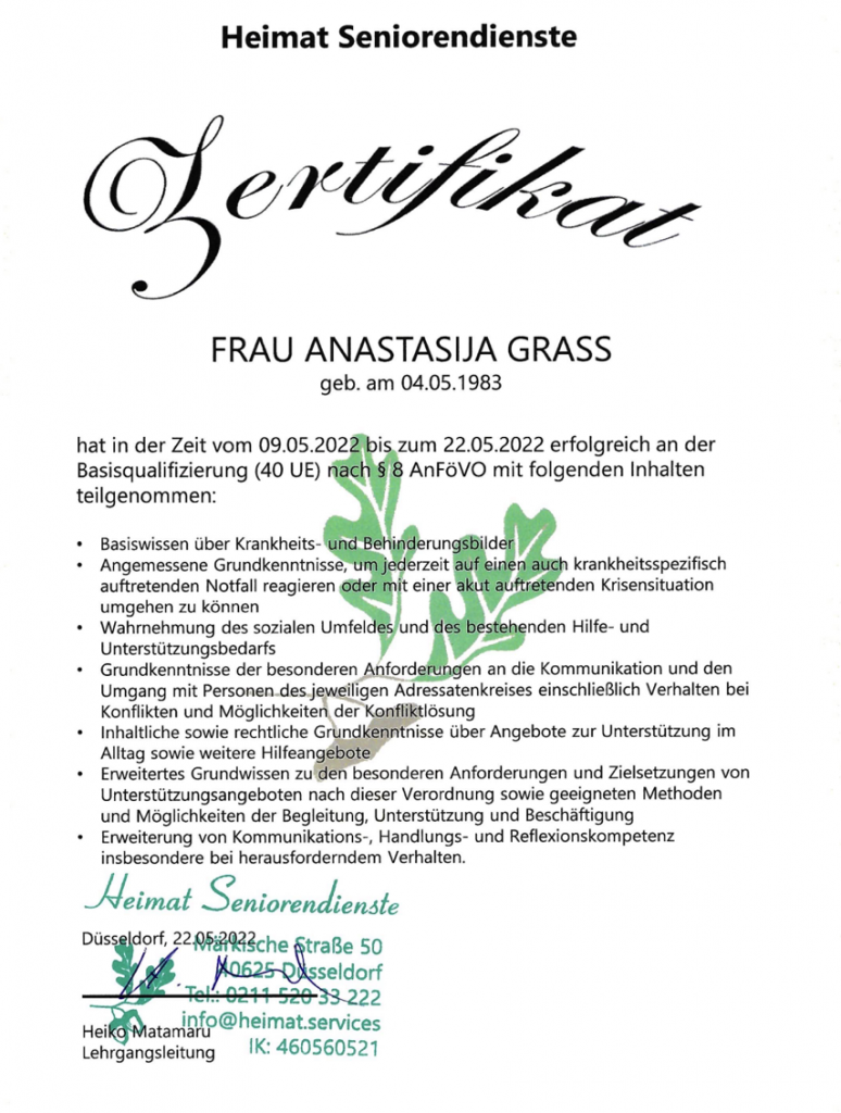 Unser Angebot offiziell als Unterstützungsangebot im Alltag gemäß § 45a Abs. 1 SGB XI staatlich anerkannt. Diese Anerkennung durch die zuständigen Behörden (nach AnFöVO NRW) ist für Sie weit mehr als nur ein Zertifikat: